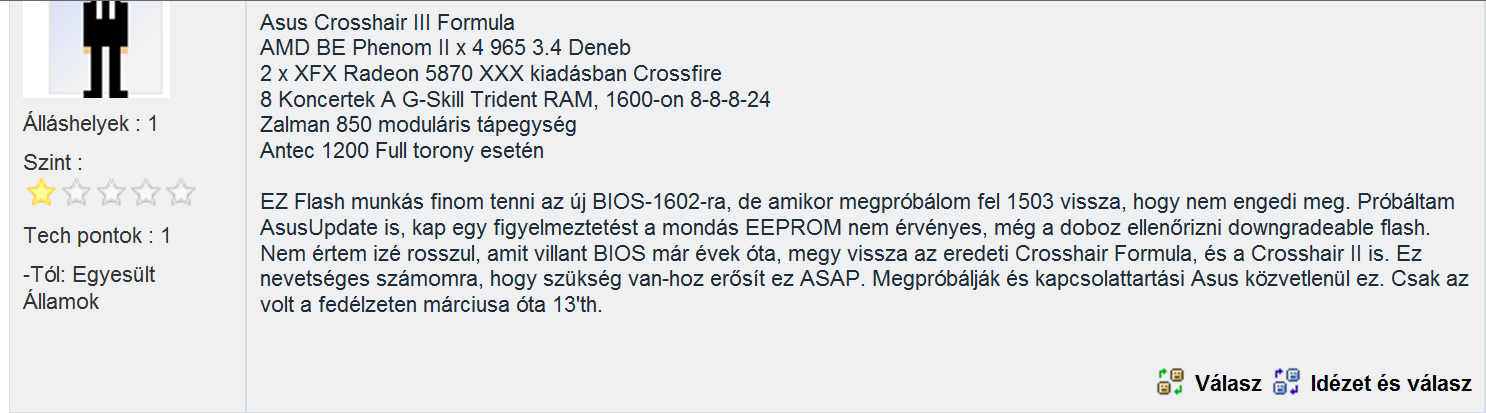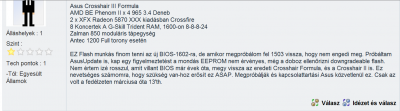 Tud valaki segíteni (mi most a diagnózisom, mit lehet tenni, hol keressek segítséget...). Az Asus szervízben azt mondták, hogy az alkatrészeket küldik külföldre szervízbe. Ha lenne olyan kütyü, amivel vissza lehetne írni a BIOS chipjébe az eredeti BIOS verziót, azt hiszem ez egy gyors megoldás lenne. (Tudom, Gigabyte MA785GT-UD3H lapot kellett volna vennem (én ilyet is vettem, de ez most egy másik és hosszú történet, hogy miért van mégis ez az Asus-om), az biztos, hogy Asus lapot soha többé nem veszek.)