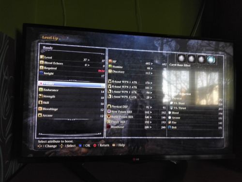 Arra is figyelj, hogy mire skálázódik a fegyver, amit használsz. D-c-b-a-s a sorrend. Pl a ludwig greatsword azért annyira jó, mert arcanera s-el skálázódik, de még str és skill-re is c-vel. Ez azt jelenti, hogy ha ezeket az attributumaidat fejleszted, akkor bizonyos mértékben a fegyver sebzése is nö. Plusz erre rá lehet tenni sebzesnovelo varazslatot is.