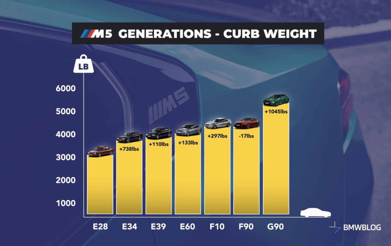 Számomra a csúcsot az 5-ös szériából a G30 viszi. Valóban arra indult a fejlesztés,hogy végre könnyebbek legyenek az autók és el is érték az elődhöz képest nagyobb lett merevebb karosszéria még több extra lehetőség de mégis a súlyon sikerült faragni. Végre elértük,hogy nagyobb jobb autókat gyártottak ami még ráadásul könnyebb is volt az előző generációhoz képest. Azóta pedig látjuk mi megy.... Ez a kép most kifejezetten az M5-re vonatkozik de látszik a lényeg. A legszörnyűbb,hogy az F10 sima hátsó kerék F90 már xdrive a G90 meg G90....