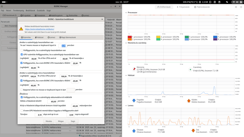 Most a Science United-ben vesz részt a gép, ezért hol ezt, hol azt számol. a Profilban csak azt lehet állítani, hogy 30%, 50%, vagy 100% CPU időt használjon. Ugye furán kifordított logikával működik, csak akkor fut, amikor a gép amúgy is használatban van. Gyakran látom a képernyővédőn, hogy nem dolgozik, mert nincs használatban a gép (No running task Computing suspended while computer not in use).