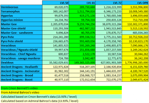 asszem én egy kicsit megkésve jutottam el abba a fázisba, amikor a raid bossokkal szórakozik az ember - de hátha más is van így. összedobtam egy táblát, ami tartalmazza az összes health adatot 50-es, 61-es, 72-es és OP8-as szinten, egy játékos esetén: