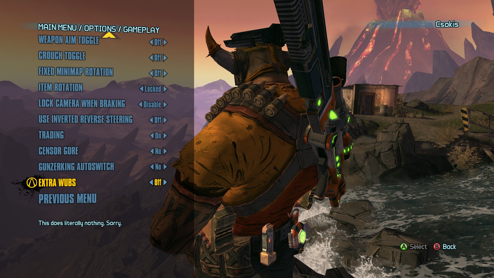 Enter the Konami Code at the game’s title screen (Up, Up, Down, Down, Left, Right, Left, Right, B [crouch for PC/PS3 players], A [jump button for PC/PS3 players], Start) and then head to the gameplay tab in the options menu. At the bottom you will notice a new option titled “Extra Wubs” with a choice of either On or Off, sadly there’s also a message that states that this option does absolutely nothing with an apology from Gearbox.