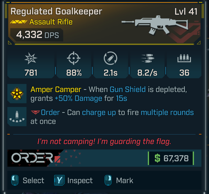 És a DPS-e akkora, mint egy 3-4 szinttel nagyobb fegyvernek, vagy még annál is nagyobb. A gun shield állandó, nem kell hozzá célozni sem. Kár, hogy Order licence-szel jött.