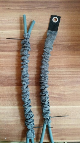 Annak ellenére, hogy délelőtt azt mondtam, hogy várok holnapig bármiféle mókolással, mióta hazaértem ezzel kínlódtam. Eredmény, a kábelek el lettek rejtve a csövekbe. Alapgondolat az volt, hogy kábelharisnya végére zsugorcső. DE a harisnya és a kábel közt túl nagy a méret különbség, így ami ráment a harisnyára, az nem szűkült össze annyira, mint a kábel, ami összeszűkülne az pedig kicsi a harisnyára, így maradt a sziKszalag megoldás. Még majd pofásítok rajta, de nem lett annyira ótvar, mint amire számítottam. A csövek végére menni fog ilyen csődugó, a kép jobb oldalán a markolat tetején látszik is az egyik, így még az sem fog látszódni, hogy a csövekben mennyi kábel van.