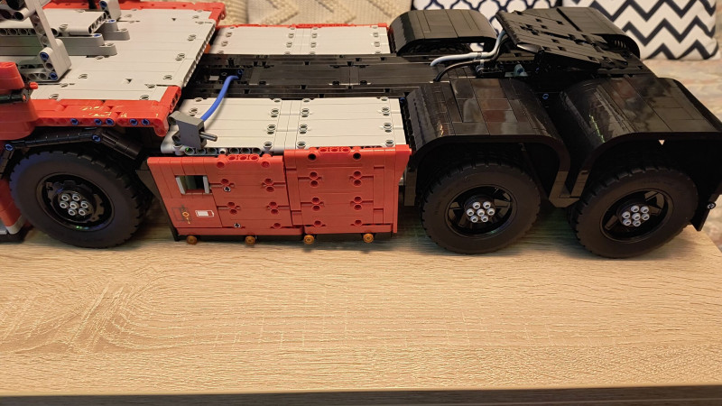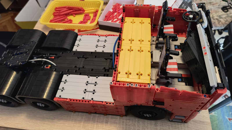 Építés szempontjából nem túl bonyolult ez a rész, egyedül a pneumatikus csövek bekötése okozott gondot, néhol eléggé szűk helyeken kellett őket csatlakoztatni, de ettől eltekintve tényleg semmi gond nem volt velük. Ha elkészül a két tengely, össze kellett őket kötni (a csatlakozókat is fémre cserélték), majd hozzáépíteni a már elkészült részhez. Itt lehet nagyjából érzékelni, milyen nagy modell lesz, hiszen ez még csak az alsó rész, még jön rá a fülke, hátulra meg az egész felépítmény... Durva lesz.