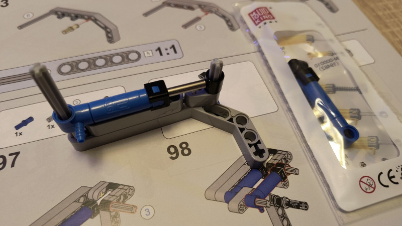 Miután sikeresen leteszteltünk mindent, kezdődhet az építés. Nem sokat teketóriázhatunk, egyből bele kell csapnunk a lecsóba, ugyanis mindjárt az első kis rögzítő keret építésénél elkezdődik a pneumatikus rendszer csöveinek bekötése is. A készletben háromféle színű (kék, szürke és fekete) gumitömlő van, amit nekünk kell méretre vágnunk. Minden lépésnél írja, melyikből hány centiméteres darabot kell levágnunk, majd bekötnünk a megfelelő helyre. Ennél a résznél figyelni kell, mert ha rövidre vágjuk a csöveket, nem fognak passzolni. Ajánlott a könyvben lévő ábrákat használni mértéknek.