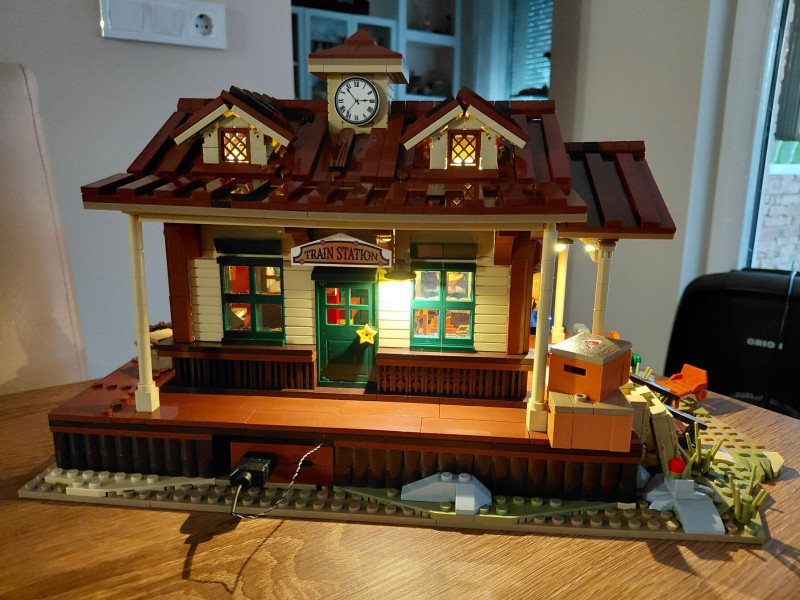 Az óra a vonattal érkezőknek és a város felöl a vasútra sietőknek van, az állomáson belül pedig van óra az utasoknak.A Lego általában ezen épületek hátuljára nem helyez nagy hangsúlyt, itt pont az ellenkezője történt, így már van értelme a középre helyezett toronyórának.
