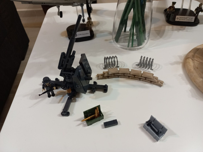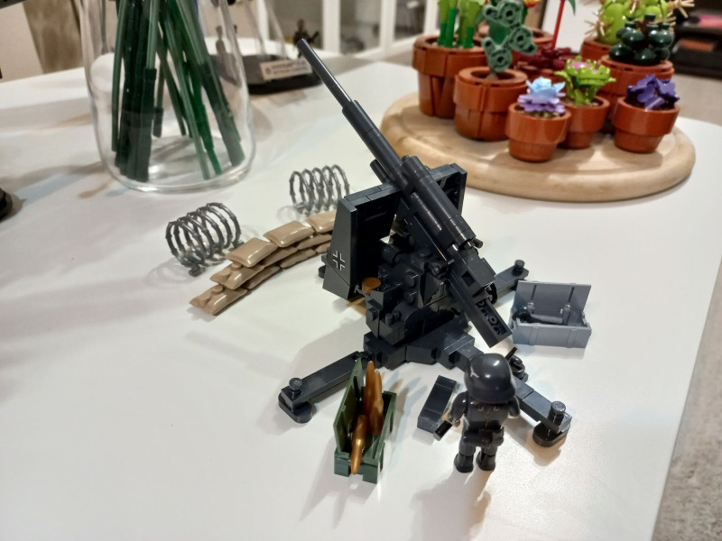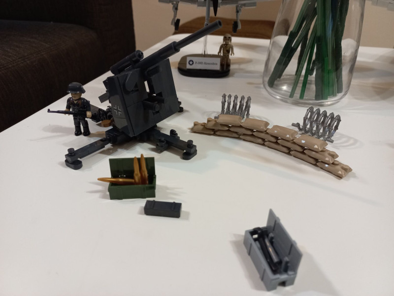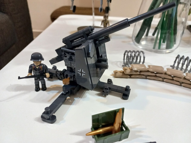 88mm-es Flak. Nagyon jól lemásolták a valódi ágyút. Maga a löveg forgatható és állítható vízszintestől a majdnem függőleges állásig. Külön tetszik a hozzá adott homokzsák köteg, 2db szögesdrót akadály, szerszámos láda, és lövedékes láda, na meg az 1 db német luftwaffe katona. Egy két apróságtól eltekintve az egész szintén stabil, masszív, jól összerakott és megépített és jól játszható szerkezet és szerintem a későbbi épületekhez képest az arányait is eltalálták. Majd kiderül. Minden esetre azt mondom hogyjó lett. A mall.hu-ról rendeltem ott ez volt az utolsó darab kb 9.000ft-ért ennél már csak drágábban kapni. Jó lenne ha kevesebbe kerülne, mert ezek azok a dolgok melyekből többre is szükség lenne, de sajnos a Cobi is kezd drágulni.