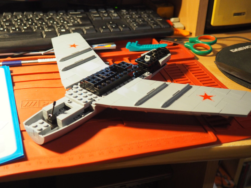 Megérkezett a MiG-15, meg is építettem. Két zacskóban érkezett. Az építési élmény többé kevésbé megegyezik a LEGO-val. Annyi, hogy a színes elemek teljes hiánya valóban egy kicsit nehezítenek a dolgon. Kb. háromszor megakadtam az építésben. Egyszer azért, mert egy 2x7-es elemet raktam véletlenül oda, ahova egy 2x8-as elem kellett volna. Illetve egyszer azon ment a lamentálás, hogy két elemet hogyan kell helyére rakni, mert a leírás nem volt egyértelmű. A harmadiknál meg megkavart egy elem megfelelő helyre rakása. Ez mind az összerakási furcsa megközelítéséből ered.