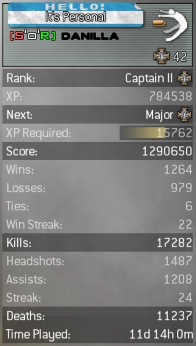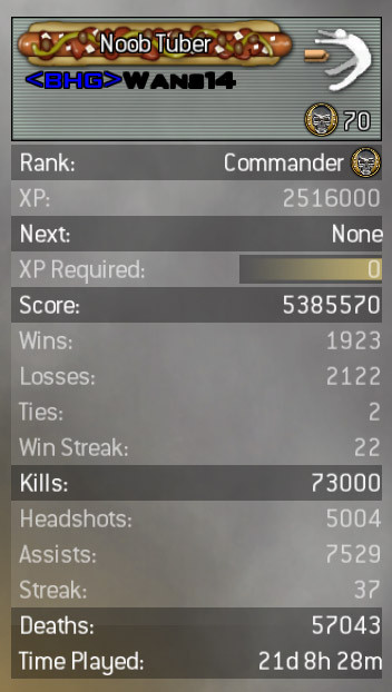Meg aztán nem is merem berakni nehogy feltűnjön nektek,hogy a 127000 killem mind egy szálig headshot volt,ja és a "time played-nél nekem az áll "0d1h10m".