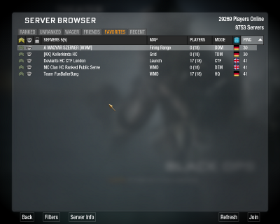 , én csapatot se tudtam váltani, folyamatosan szürkében van, nem lehet rányomni a gombra, pedig nem egyszer volt hogy 6v9-ben játszottunk és átmentem volna az arányt javítani a csapatok között. Pedig igazán jó lenne, ha legalább a barátokkal 1 oldalon lehetne játszani.szerk.: a biztosan HQ szerverét nem látom most a kedvenc listámban, lehet hogy most offon van a szeró, majd csinálok később egy képet a kedvenc szerókról