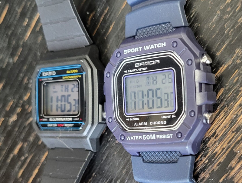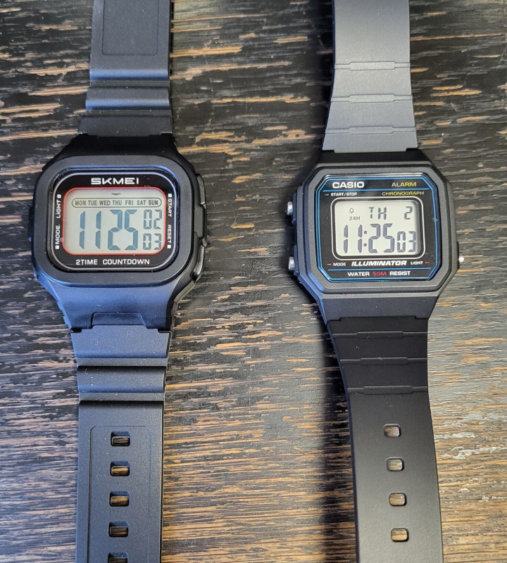 A Casio W-217 kínai "Sanda 2156" megfelelőjéről mindenfelé jó review-kat írtak, lőttem egyet Aliról, megjött: katasztrófa... funkcionalitásban teljesen rendben lenne, az eredetihez képest van visszaszámláló, a szíj kellően hosszú és lágy műanyag, a világítása sokkal jobb - épp csak a lényegi funkción, az idő kijelzésen bukik el, mert ha nem pont szemből néz rá az ember hanem bármelyik oldalra akár csak pár fokkal kitérve, brutális szellemképesedésbe kezd a kijelző, gyorsan eljutva az olvashatatlanságig...