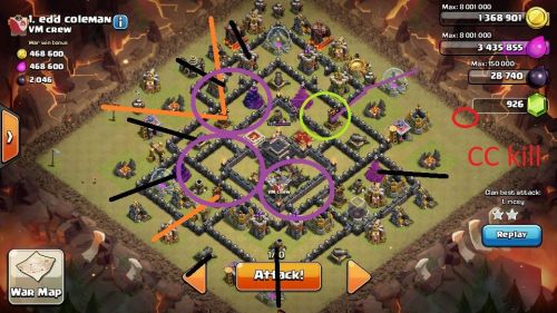 TH10 3 star egyébként nagyjából abból áll hogy kill squad-dal letoszol 1 AD-t, 1 infernot AQ-t és CC-t, majd 4 hound és loonok a bázisra clockwise/counterclockwise. Viszont ahhoz hogy ez tényleg működjön, hát... Nem tudom hogy mi kell mivel sohasem próbáltam.