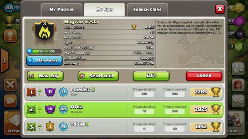 Uj tagokat varunk a clanunkba, ahova a minimum a lvl70. A cw-k folyamatosak, de ha benne vagy, 2x kell tamadni. A clan meg tavaly szeptemberben alakult, ebbol is latszik, h nem hulye gyerekek alkotjak, hanem egy osszetarto csapatrol van szo. Ha tagja szeretnel lenni, jelentkezz! Magyar vizsla!