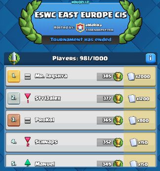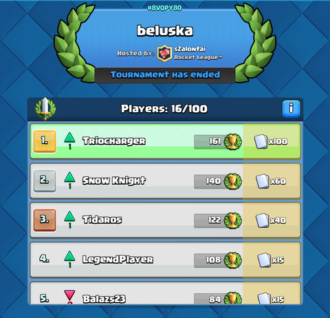 Én toltam végig, de esélytelen voltam. Hiába a tourni cap, gyakorlatilag aki 4k trophy felett van, azzal én jelenleg nem tudok versenyezni. Annyira profin rakja a unitokat, többnyire nyerő elixir tradeket csinál stb. 1x voltam csak 100on belül, a legvégén 270. lettem. Tapasztalat szerzésnek jó volt, de kártyáért nem ilyenre kell regelni (: