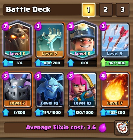 Jelenleg igy állok : gólem 5 , lighting 5 , bébi sari 5 , ec 8 , goblin gang 11 , arrow 9 , minions10 mega m 8