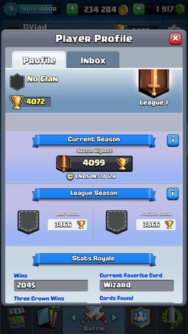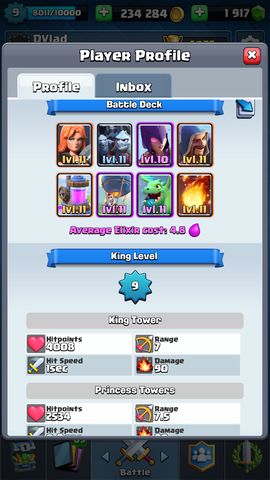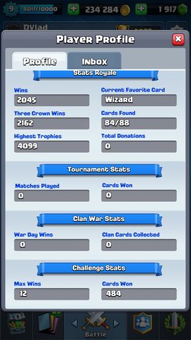 Én csak pár lapot fejlesztek a kezdetek óta, a többi nem érdekel. A leggyakoribb lapjaim: Valky 13, Ballon 12, Wizard 13, Freeze 11, Baby D 12, Poison 11, Minion H 13, Furnace 13. Néha a Baby helyett Fireball 13-at vagy Witch 12-őt használok. A többit alig vagy sehogy nem fejlesztettem. Rengeteg lapom (6000, 8000, 9000), pénzem (660k), Gems-em (még sosem költöttem egyet sem) van, pénzt még nem fizettem a játékért.