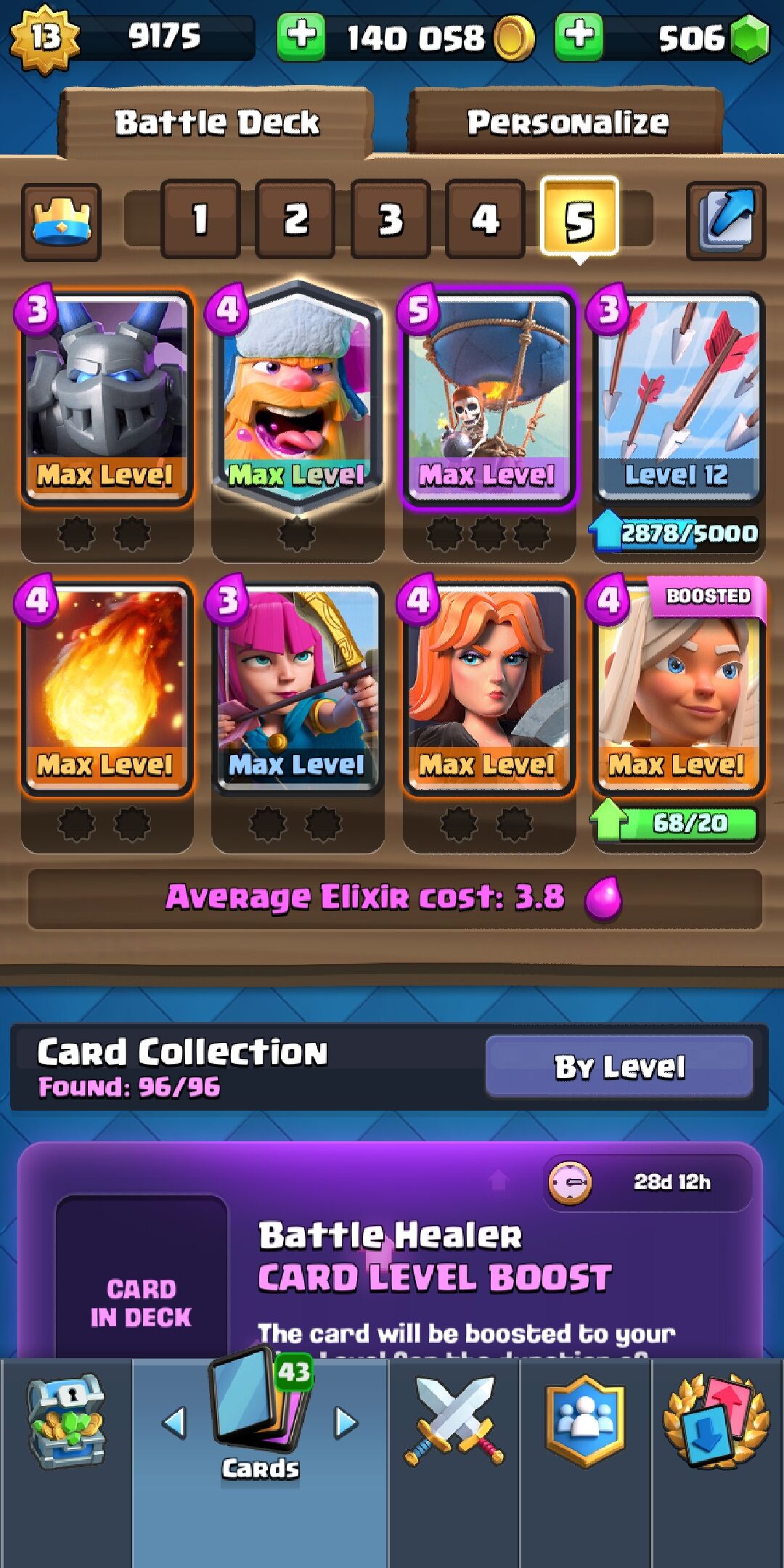 A rarek közül minden lap legalább 8-9 körül van, néhány hetes. (Kivéve Battle ram, Bomb Tower, Rocket, Heal ezeket soha nem használom, level 4 alatt vannak.)