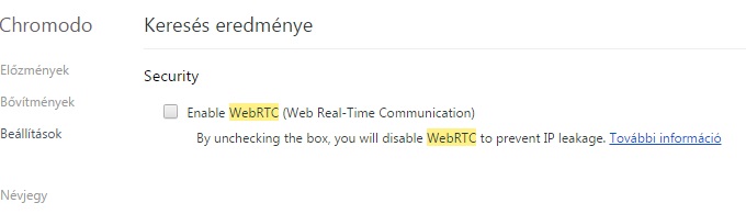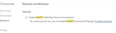 A második fülön kattintva ,és a fülön lejjebb lévő linken kattintva elnavigál a beállítások menü WebRTC mneüpontjához: