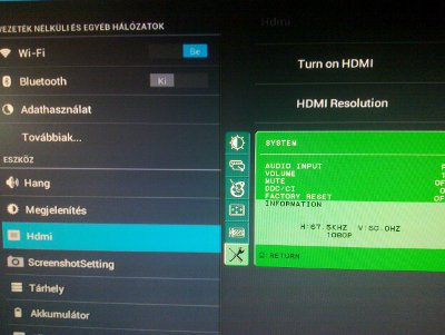 Amikor rádugtam a hdmi monitort, akkor alapból 720p felbontást jelzett az ki, úgy hogy a tableten ki volt véve a pipa a hdmi mellől. Amikor bepipáltam akkor 1080p-re váltott. A tablet képe 720p alapból, ezt lehet nagyítani a fullhd-ra a beállítáoknál. Kissé homályosabb a hdmi képe, nem tudom az android hogyan másolja a tartalmát, olyan mintha át lenne tömörítve.