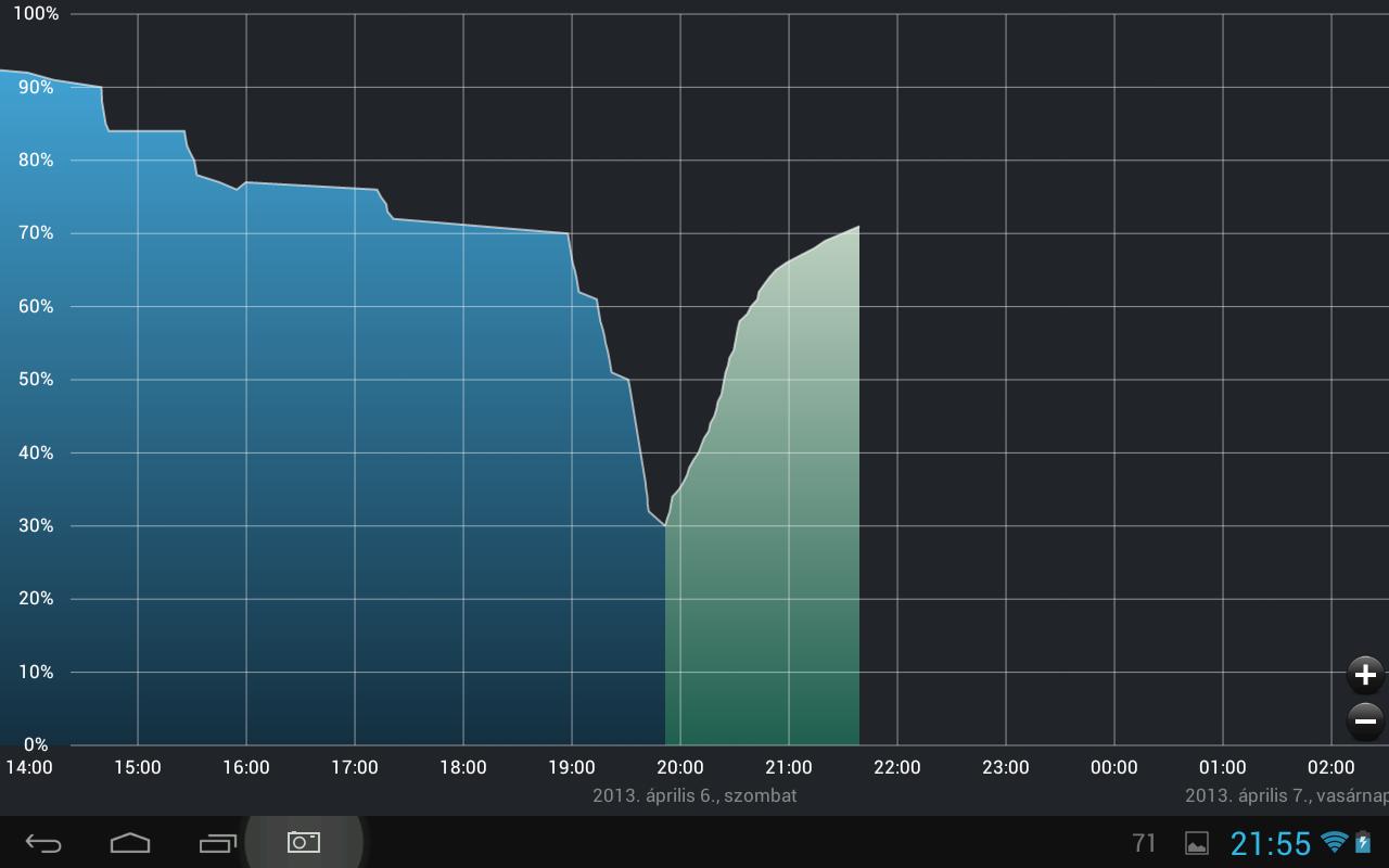 Nekem így néz ki a merülés / töltés szakasza. Este 100%-ról 75%-ig használtam, kb 1,5-2 óra netezés + youtube, lemerült 75%-ra ott letettem wifi ki látszik hogy stagnált egy ideig utána pedig elkezdett merülni.