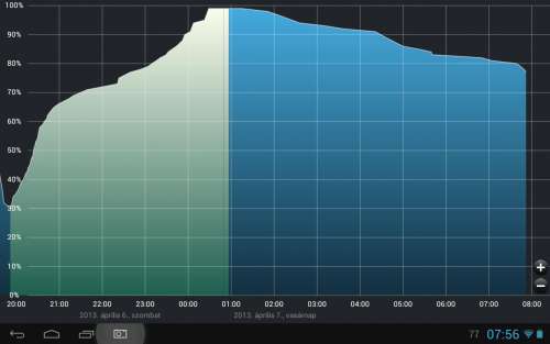 Az este 100%al tettem le, standby módban. 7h33p után 77%, úgy, h az égvilágon semmit sem csináltam. Ugyanakkor, az akku menüben azt írja, h tétlen táblagép esetén 97%. Ha jól értelmezem, akkor a gép ezek szerint 3%ot fogyasztott, de akkor hová lett a többi delej