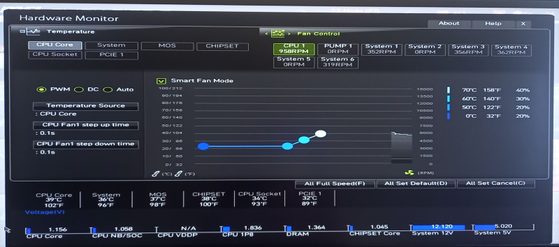 Ugyanez a felállás, csak P12 Max ventilátorok. Megjegyzem, bár nem nyúltam hozzá az UEFI beállításokhoz, az RPM magasabb lett, mert ezek a ventilátorok eleve többet forognak. A hőmérsékletek is várhatóan alacsonyabb lettek. A zajszint is sokkal jobb...