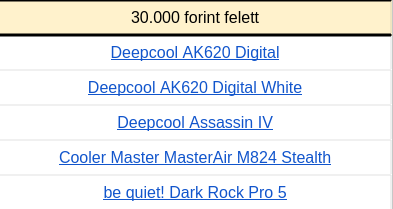 A Thermalrighttal barátok vagyunk, eddig nem volt gondom, illetve a másik esélyes, az ID kiesett a gagyi ventilátora miatt. Más hűtőt meg nem is tudok, ami adott áron ilyen teljesítményű. -
