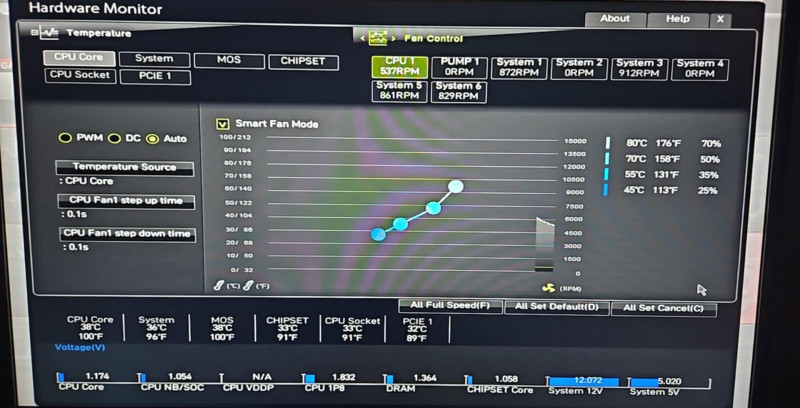 Szépséges config, jó helyre ment a Phantom Spirit! A hőfokok pedig bajnokok. Ha jól gondolom, akkor neked is Tomahawkod van. Kis dolog és nem biztos, hogy van jelentősége, én a ventilátoroknál nem szoktam "AUTO"-n hagyni a vezérlést, hanem átrakom "PWM"-re, hogy egyértelmű legyen. Természetesen DC ventilátornál pedig minél hamarabb "DC"-re kell tenni.