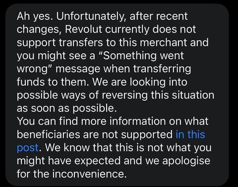 Nem támogatott kereskedő címszóval.Bár akkor sem értem, ezt a Revolut Support írta, de közbe meg még müködik.