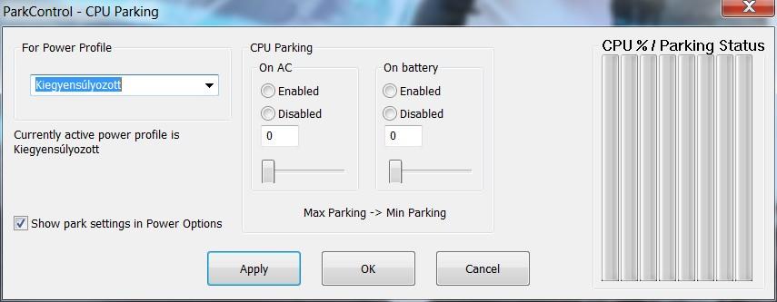 - This value represents the % number of cores the system will park - the default 100% ie: all Cores are potentially park-able (Az alapértelmezett beállíáts: 100%, azaz minden mag potenciálisan "leparkolható").