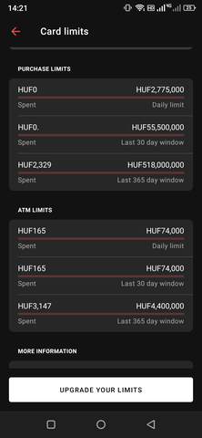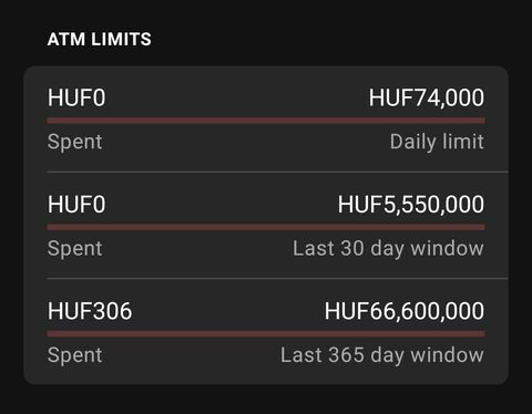 Úgy rémlik, hogy korábban a daily ATM limitre szépen írta a 200 fontot, még most is ehhez tartom magam. Viszont ha pl leveszek 200 fontot, a daily limitnél az látszódik hogy 200 fontnál tart a csík a 185,000 -ből