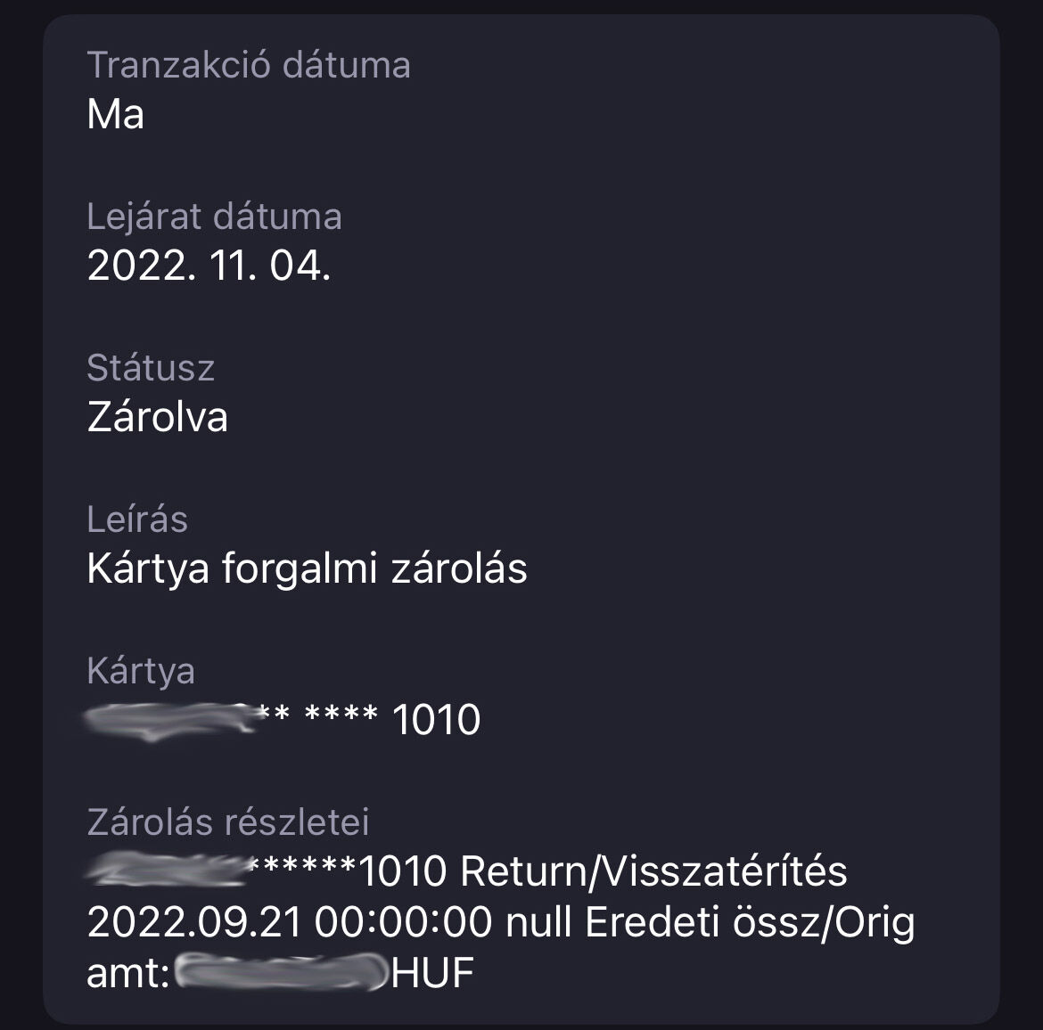 Két lehetőség van, mindkettő előfordul. Mivel az összeget először csak zárolja a bankod, néha sajnos zárolásban is ragad (a lenti bal oldali képen látható felirat esetén fordulhat elő), aztán napok múlva automatikusan felszabadul. A napok száma bankfüggő: a Revolutnál például 7, a K&H-nál 10, az Ersténél 15 nap, de egyes bankok (Raiffeisen, OTP, Cofidis) még hosszabb ideig, akár 30 napig is zárolásban tarthatnak egy-egy tételt.