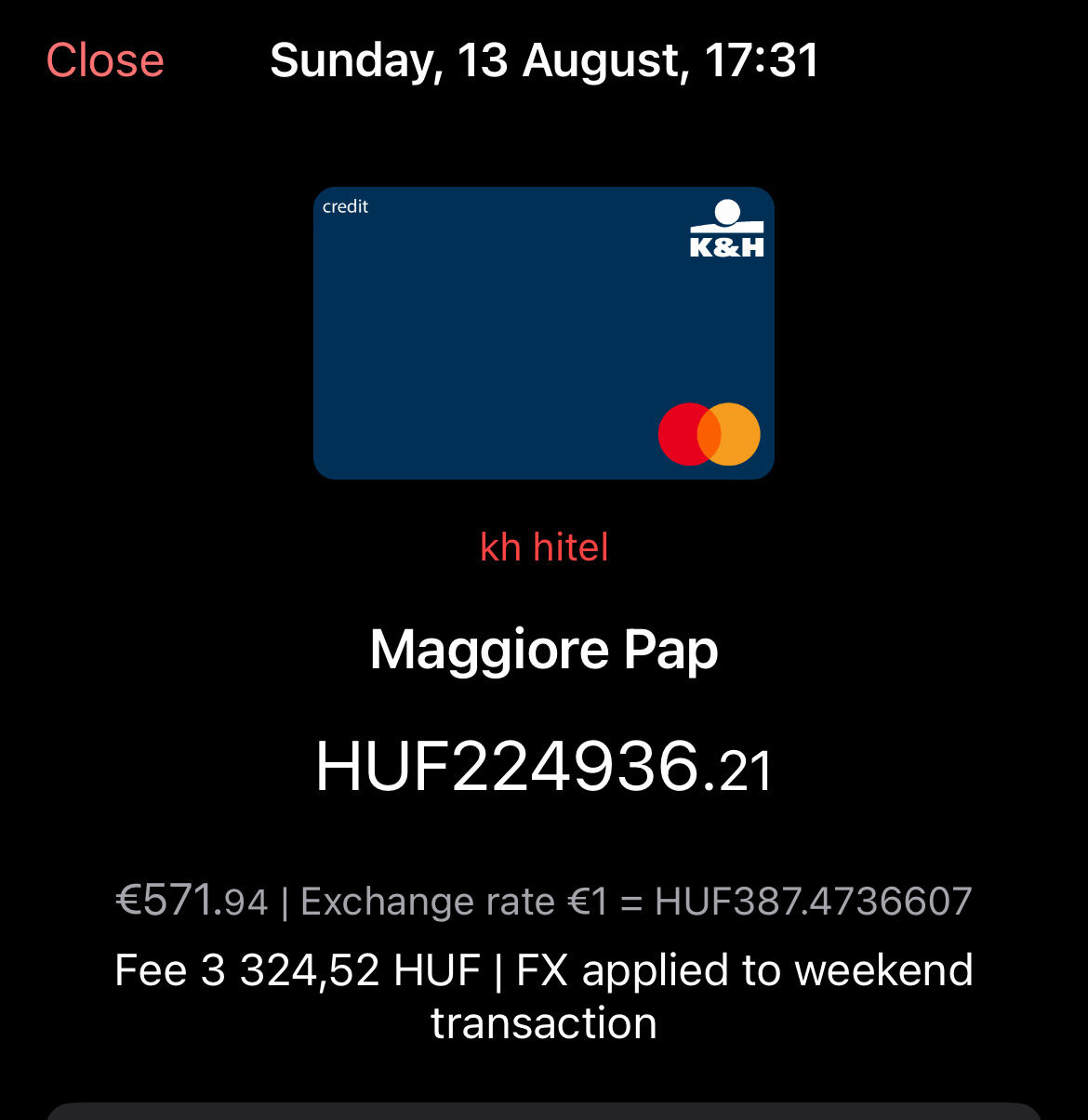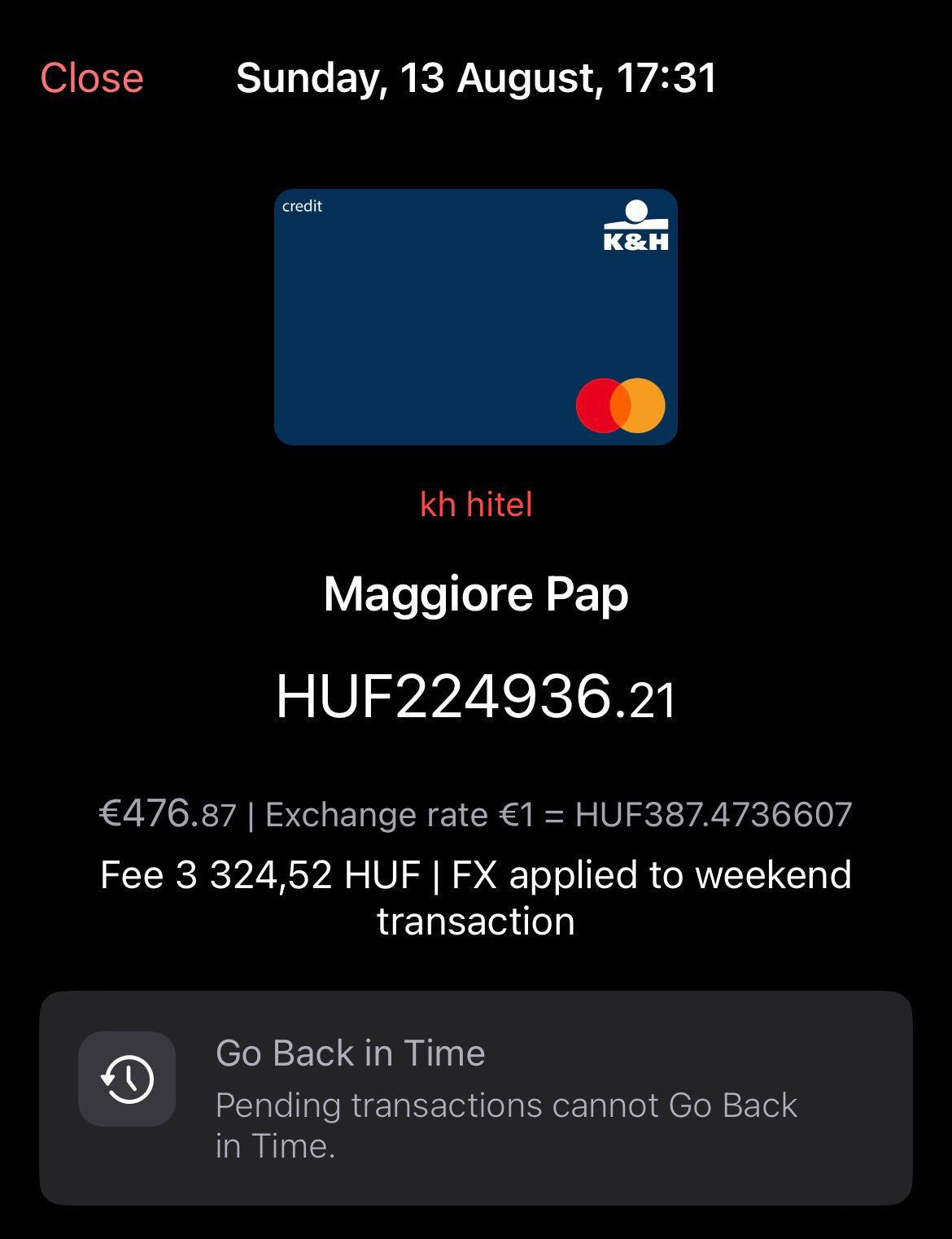 autókölcsönzőben fizettem vele, vagyis az eredeti összeg egy pre-auth volt 571,94 eur értékben (tegnap). a visszavitelnél szándékosan kértem kártyacserét a curve-re a hétvégi díj ellenére is, mert kaptunk egy defektet, ennek költségeként pedig a visszaadáskor 250 euró plusz díjat számoltak fel*. nem akartam, hogy ismeretlen árfolyamon majd az erste váltson, amit eredetileg használtam (hitelkártya), ráadásul már a 200 ezres visszatérítési keretet is kimaxoltam 10. óta, így a teljes költség pocsékba ment volna. curve-vel legalább a back in time hozhat később egy kis pluszt