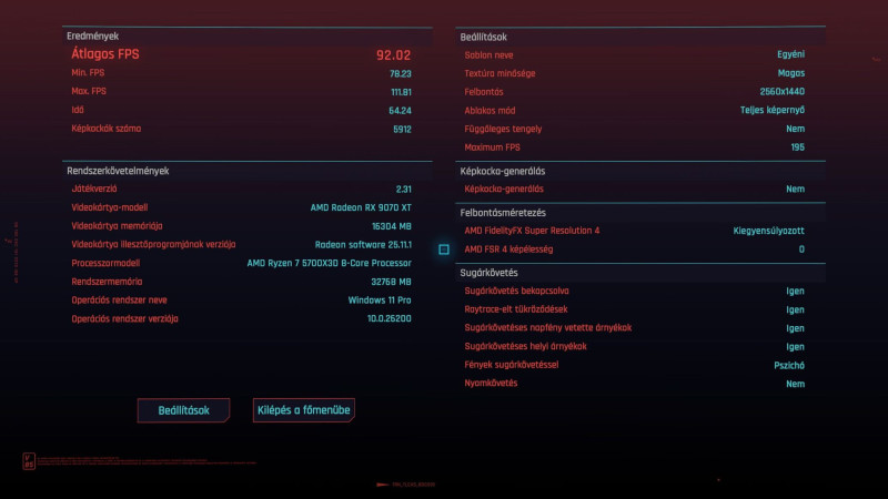Most játszottam vele egy jó órát, nem volt különösebb gondom. 1440p, borderless, FSR4 auto, és ami a poén, PT-vel, és majdhogynem stabil 60fps volt, sima RT-vel pedig teljesen. Ugye tv-m nem tud többet, így le volt fixálva ennyire. Néhol leesett ugyan ~45 környékére és ekkor azért lehetett érezni a döcögést, de nagyrészt 56-60 között volt és kb. simán futott. A tévém tud ALLM-et és VRR-t, igaz csak 45-60Hz között, így biztos az is segített kicsit (bár ez be volt kapcsolva korábban is).