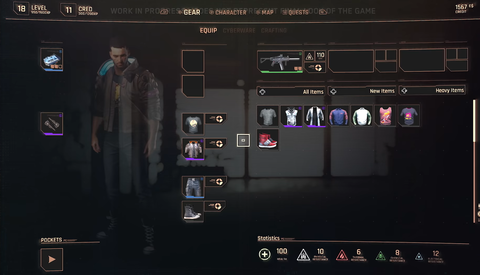 -Ez után mintha a felszerelés menünél járhatnánk. A kép szerint három fegyver és talán két "gyorsgombon" lévő eszközt helyezhetünk el, az egyik gondolom a Deck-ünk, amivel a hálózatra csatlakozhatunk. A karakternek két-két-két felszerelés helye van a lábon (cipő és nadrág), a testen (póló és kabát) illetve a fejen (itt nincs semmi, feltehetően napszemüveg és/vagy sisak, sapka, stb. rakható ide). A karakter 18. szintű, a Cred (~hírnév) pedig 10-es. Jobb oldalt alul látható az életerőnk (100, de feltehetően ez százalék-alapú), valamint négy 'ellenállóképességünk', ezek fizikai, hő (tűz), kémiai (méreg) és elektromos. Fent a karakterfelszerelés mellett két opció van, a Kiberver és a Gyártás.