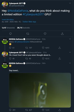 A CP2077 hivatalos tweetje üzent az nVidia-nak, hogy nem szeretnének-e egy Cyberpunk 2077 témájú GeForce kártyát kidobni a piacra? Az nVidia először egy elgondolkodós smiley-val válaszolt, mire a CP2077 tweet válasza tovább húzza, hogy ugyan már, ne mondják, hogy sose gondolkodtak el rajta. Válaszul az nVidia egy erősen elmosott képet rakott be, amin egy referencia RTX kártya látható fekete-ezüst-sárga színben.