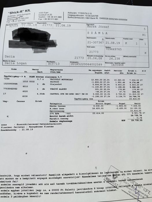 Az első éves revízió + olajcsere 65000.- (Sandero Stepway 1.0 TCe)