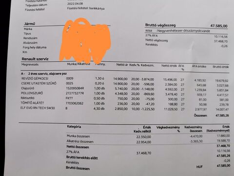 Nincs előttem a szervízkönyv, de 5 év alatt ami komolyabb tétel 2 olajcsere, és 1 gyertyascsere. perpill úgy tudom 19eFt áfásan az óra díj.