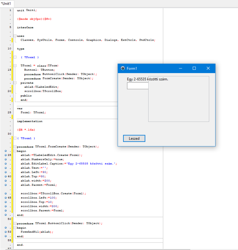 procedure TForm1.atmenukatt(Sender: TObject);varablak: TLabeledEdit;begincase TMenuItem(Sender).tag of0: begin(...)end;1: begin(...)end;2: beginablak:=TLabeledEdit.Create(Form1);ablak.Parent:=Form1;ablak.NumbersOnly:=true;case nyelv of0: ablak.EditLabel.Caption:='Egy 2-65535 közötti szám.';1: ablak.EditLabel.Caption:='A number between 2-65535.';end;ablak.Text:='';ablak.Left:=width div 2;ablak.Top:=height div 2;ablak.OnKeyDown:=@menuszamadas;aktkxhely:=khelyx div tvcsempeszel;aktkyhely:=khelyy div tvcsempemag;end;end;end;procedure TForm1.menuszamadas(Sender: TObject; var Key: word; Shift: TShiftState);beginif (Key=VK_RETURN) and ((Sender as TLabeledEdit).Text<>'') and (strtoint((Sender as TLabeledEdit).Text)>=2) and (strtoint((Sender as TLabeledEdit).Text)<=65535) thenbegin(...)//Itt kéne megsemmisíteni is az Ablak-ot, pl. FreeAndNil(Sender);end;end;procedure TForm1.tvracsegerkatt(Sender: TObject; Button: TMouseButton;Shift: TShiftState; X, Y: Integer);var iderakdx,iderakdy: word;atmenu: TPopupMenu;atmenupont0,atmenupont1,atmenupont2: TMenuItem;beginif Button=mbLeft thenbegin(...)endelse //Jobb kattintásra létrejön a helyi menü:beginatmenu:=TPopUpMenu.Create(tvracskep);atmenupont0:=TMenuItem.Create(atmenu);case nyelv of0: atmenupont0.Caption:='0 (Üres)';1: atmenupont0.Caption:='0 (Empty)';end;atmenupont0.tag:=0;atmenupont0.OnClick:=@atmenukatt;atmenu.items.Add(atmenupont0);atmenupont1:=TMenuItem.Create(atmenu);case nyelv of0: atmenupont1.Caption:='1 (Akadály)';1: atmenupont1.Caption:='1 (Obstacle)';end;atmenupont1.tag:=1;atmenupont1.OnClick:=@atmenukatt;atmenu.items.Add(atmenupont1);atmenupont2:=TMenuItem.Create(atmenu);case nyelv of0: atmenupont2.Caption:='Egyéb érték';1: atmenupont2.Caption:='Other value';end;atmenupont2.tag:=2;atmenupont2.OnClick:=@atmenukatt;atmenu.items.Add(atmenupont2);atmenu.PopUp(ScreenToClient(mouse.cursorpos).X,ScreenToClient(mouse.cursorpos).Y);end;end; -