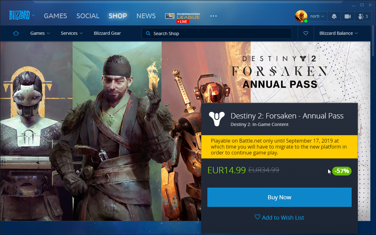 PLEASE NOTE: Following the launch of Destiny 2 Update 2.6.0 on October 1, migrated PC players will experience a delay in the transfer of their Forsaken licenses on Steam. As this work continues in the background, we invite these players to play new content introduced in Shadowkeep, or access the suite of content available for free through New Light.
