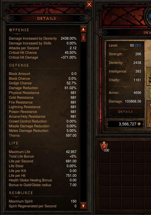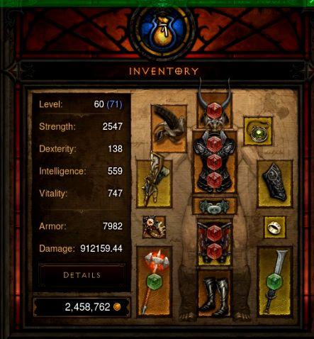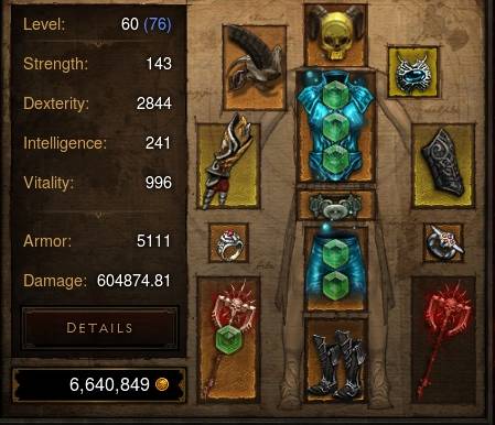 - ringek és amulett: ezek tudják a legtöbbet adni a sebzéshez (a fegyveren túl persze). Egy határig lehet épp csak statponttal növelni a sebzést, de ezeken inkább attack speed, chc (critical hit chance), chd (critical hit damage) legyen. Jó még az intervallumos extra sebzés is. Ez hozzáadódik a fegyvered alap értékéhez és nagyon megdobja a sebzést. Kiegészítőként mehet az erő. Ha van jó, ha nincs akkor az sem baj. 2-3 jellemző ezekből elég olcsón is összehozható. chc-chd-as kombó irreálisan magas szokott lenni. Extra sebzéssel és erővel lehet ügyeskedni a keresésben (ha AH-t használsz) a + a chc-chd-as hármasból kettő melléjük.