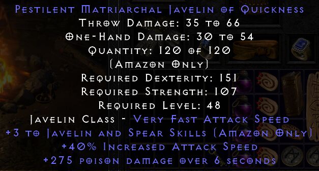 Még talán az amazonos prefix helyett lehetne még attack rating 300 vagy maxos undead plusz damage (demon elleni jön kesztyűből)... Majd wm2 megszakérti!