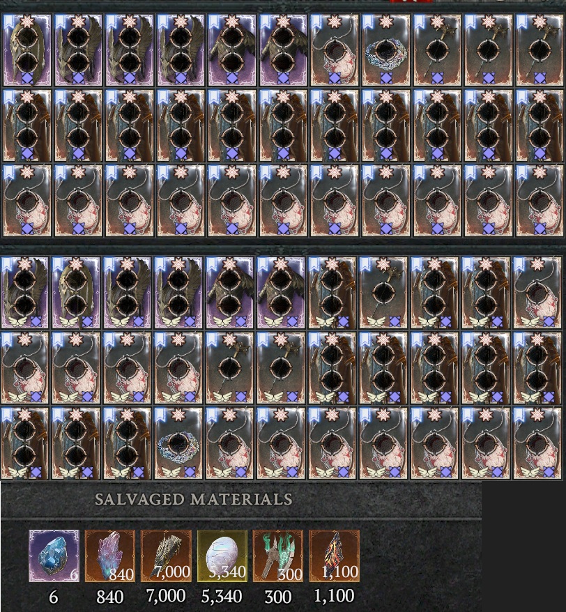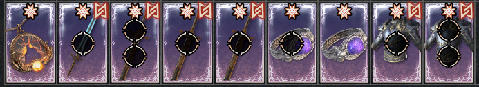 100as glyphk, szar amu, közepes gatya-kesztyű-csizma.A három lila pipa, de 1ga mind. 1ga Ancestral Unique fegyver, pajzs, gyűrű.