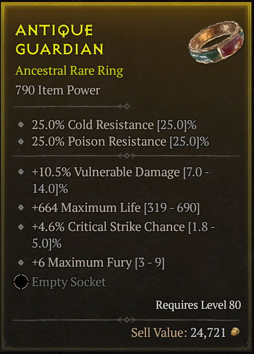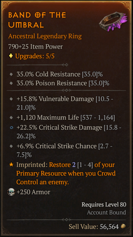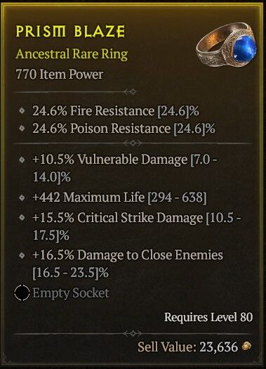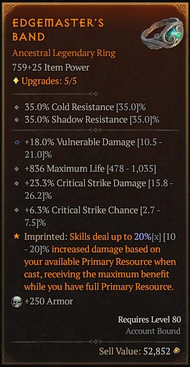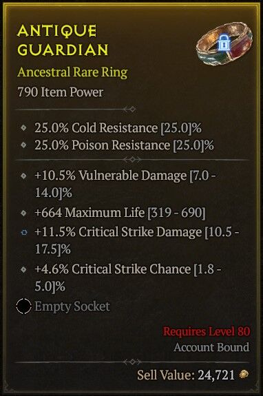 itt a gyűrű amit 70-ért vettem, és csak egy jó critical stirke dmg kéne rá. csináltam miatta egy új barbár karit is, mert ugye azzal jobbak az esélyek, belepörgettem vele 25 millát és egy csomó veiled crystalt. most ott járok, hogy egyetlen 1x beadta majdnem minimumon, és most megint grindolhatok goldot is.