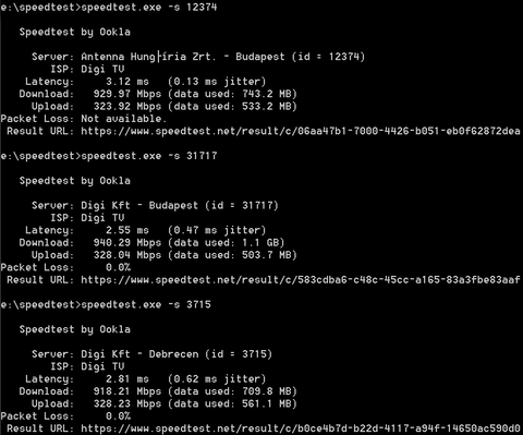 Azért nem írtam pontosan, hogy az 500/300 milyen módon jött ki, mert az elmúlt év során mindig ilyesmi értéket kaptam, ahány féle képpen csak teszteltem. Speedtest.net-et szoktam használni számítógépen böngészőből (vezetéken illetve vezeték nélkül is), illetve androidon appból. Parancssorból nem használtam. A mai üzenetem előtt is így mértem, különböző szervereket választva kerestem a legjobb értéket.