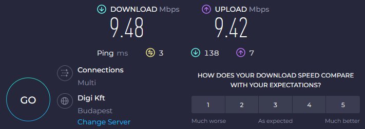 Dél pesten vagyok, napok óta ha mérnék DIGI szerverre ilyen 80-100megabit ha megvan.