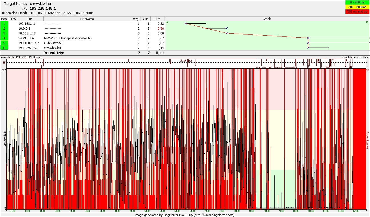 Van az alsó grafikon. A teli fekete rész az a válaszidő ms-ban. (ping) Jól látható, hogy reggel még normális (10-11 ms) de ahogy jön a csúcsidő egyből nőni kezd. Ezek a csúcsok. A kép jobb felső sarkán lehet látni 3 színt, benne pedig az értékeket. Ez a 3 szín az alsó grafikon háttere, amihez lehet viszonyítani a teli fekete részt. Tehát jóval meghaladja a 100 ms-ot csúcsidőben.