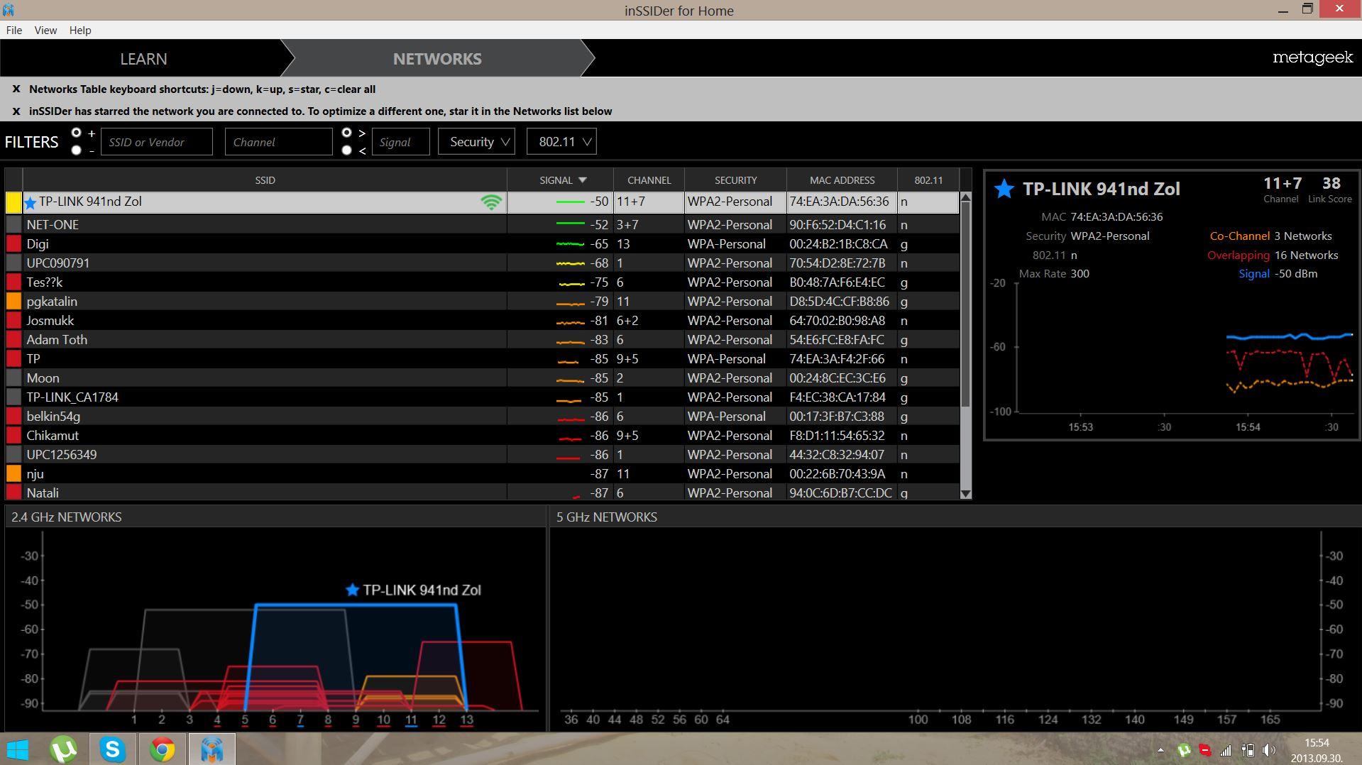 Elmentem, bekapcsoltam a tplinket is.Az asus jelenleg stabilan -50dBm, a tplink ugyanolyan (max.) teljesítményre állítva -62dBm és -58 között ingadozik. Van ebben az inssiderben olyan lehetőség, hogy hosszabb grafikont készítsek a jelszintről, mint ami az RSSI oszlopban van?