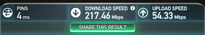 Maglód, Jókai utca: 2 perce jött az SMS a Digitől, hogy a Topnet sebesség megemelve, és tényleg: 220/50-et mértem az eddigi 80/25 helyett. Persze csak direktben, érik a router-csere...